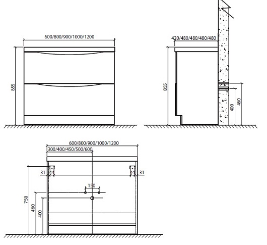 - База под раковину напольная, с двумя выкатными ящиками, с доводчиками, ANCONA-N-600-2C-PIA-WO