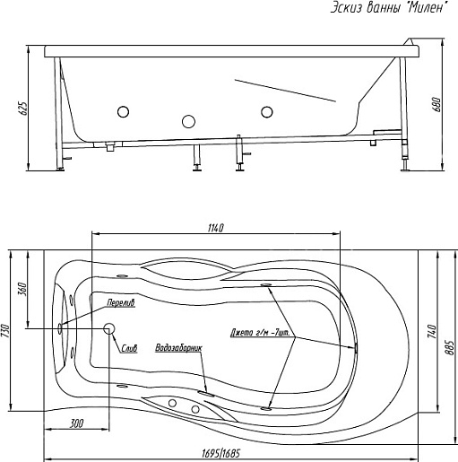 Акриловая ванна BellSan Милен 170x90 с гидромассажем.