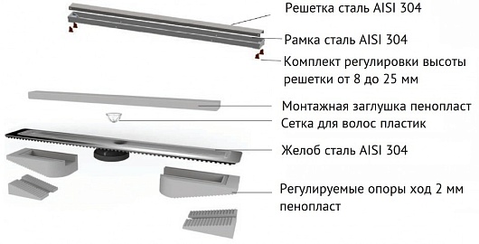 - Решетка, рамка и желоб из нержавеющей стали AISI 304.