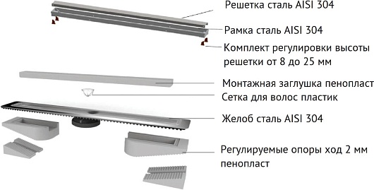 - Решетка, рамка и желоб из нержавеющей стали AISI 304.