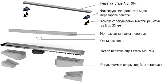 - Решетка, рамка и желоб из нержавеющей стали AISI 304.