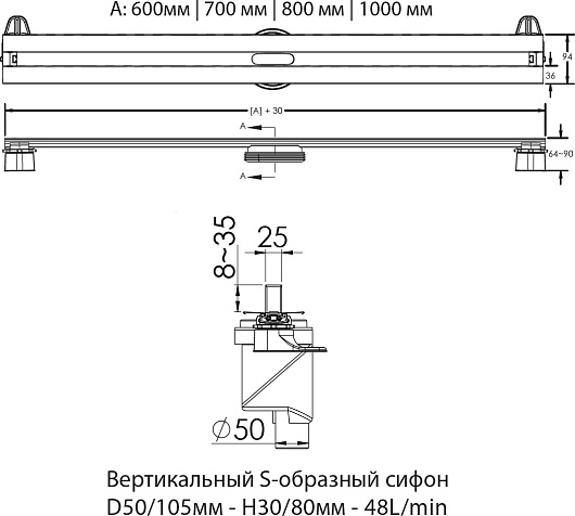- Самопромывной сифон PP: вертикальный выпуск D50/105 Н30/105, пропускная способность 48 л/мин, монтаж 360 градусов.