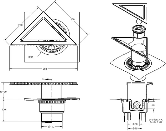 - Самопромывной сифон PP: вертикальный выпуск D50/75/110, пропускная способность 42 л/мин, монтаж 360 градусов.