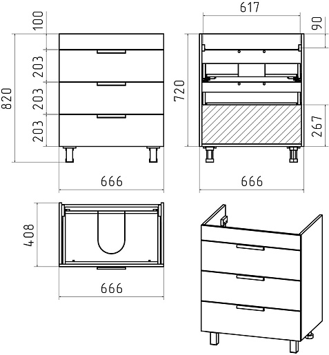 Комплектация: тумба, раковина, ножка (4 шт.).