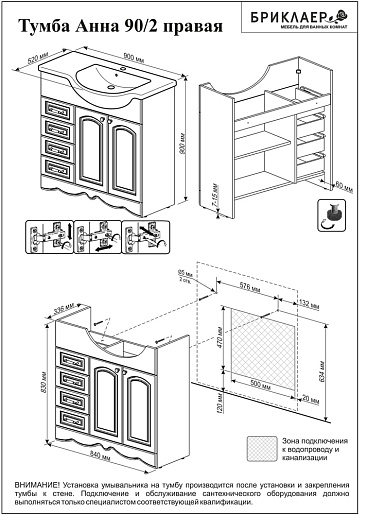 - тумба под раковину Бриклаер Анна 90 белая R: ручка - 6 шт., выдвижной ящик - 4 шт., распашная дверца - 2 шт.