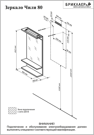 - Зеркало Бриклаер Чили / Куба 80: полка - 2 шт., розетка - 1 шт., выключатель - 1 шт., встроенный светильник.