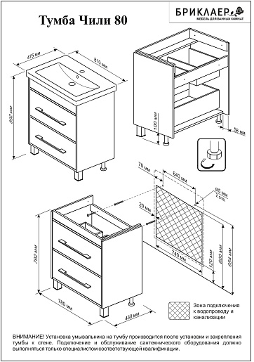 - Тумба с раковиной Бриклаер Чили 80: раковина Комо 80, выдвижной ящик - 2 шт., ручка - 2 шт.