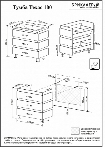 - Тумба с раковиной Бриклаер Техас 100: раковина Астория 100, выдвижной ящик - 3 шт., ручка - 3 шт.