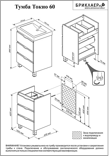 - Тумба с раковиной Бриклаер Токио 60: раковина Тигода 60, выдвижной ящик - 3 шт.