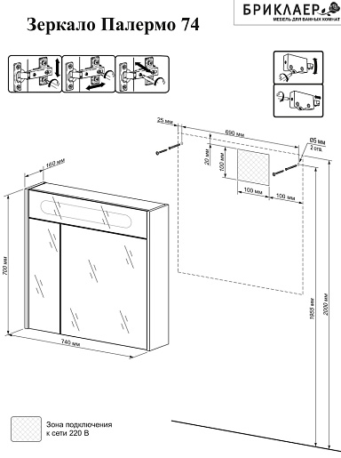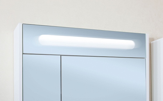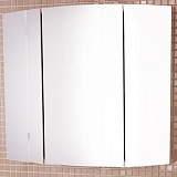 Описание: зеркальный шкаф для ванной с распашными дверцами и внутренней полкой. Встроенный люминисцентный светильник 6 Вт.