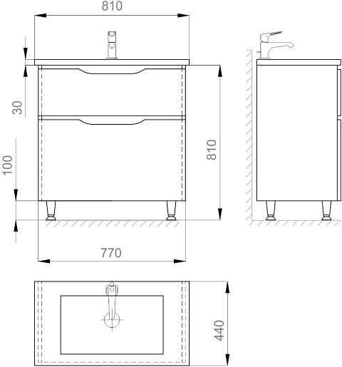 В комплекте: тумба, раковина, зеркало, ножка (4 шт.).