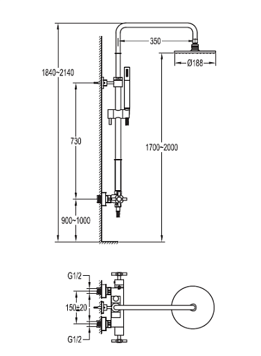 Душевая колонна с термостатическим смесителем для верхнего и ручного душа: