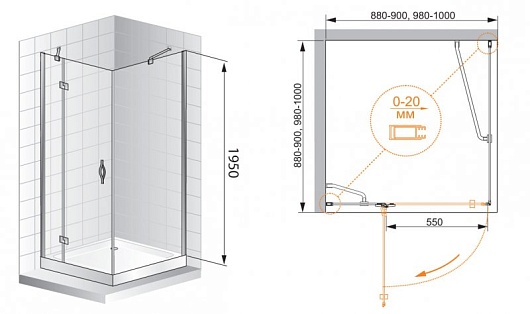 - Регулируемые габариты: (980-1000)x(980-1000)x1950 мм.