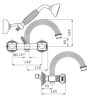- Душевой шланг, душевая лейка, настенный держатель, эксцентрики, аэратор, дивертор
