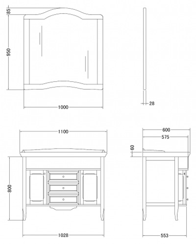 - PA-DUE02.02 База под раковину с тремя выдвижными ящиками и двумя распашными дверцами, 110x60x80 см