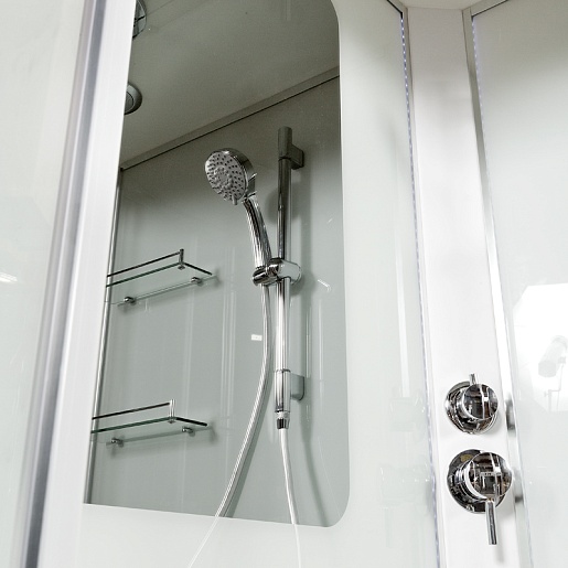 - Зеркало интегрировано в заднюю стенку душевой кабины, благодаря чему исключается вероятность коррозии.