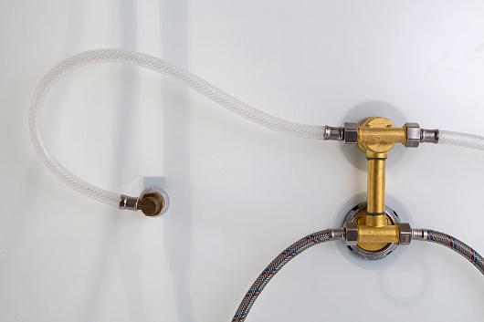 - Латунный смеситель с керамическими картриджами и резьбовыми соединениями.