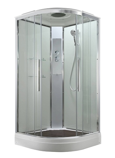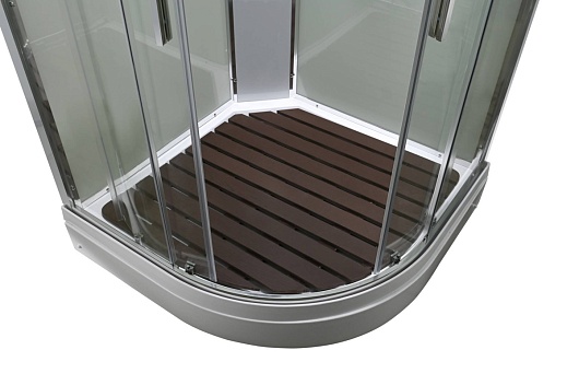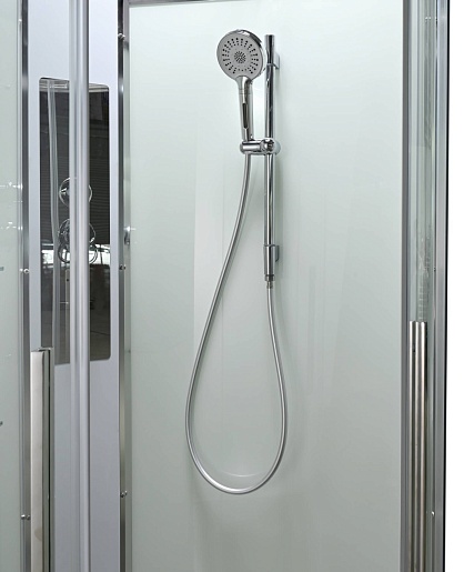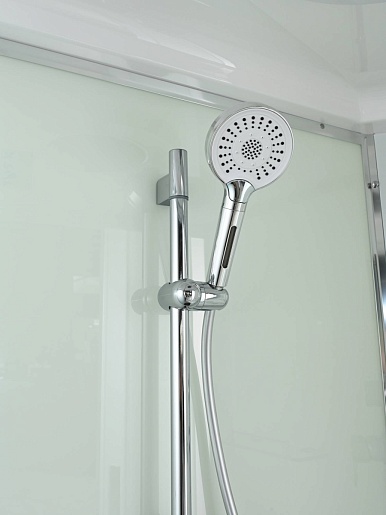 - В комплекте: душевая штанга, две полочки, тропический (верхний) душ, арома-лейка с витамином С (картридж съемный), полимерная вставка в поддон(имитация дерева), сифон, ручки дверей из нержавейки, двойные ролики.