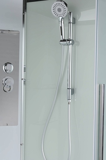 - Душевая штанга (позволяет регулировать по высоте ручную лейку), ручная арома-лейка с витамином С (картридж в комплекте, есть возможность замены или удаления картриджа), полочки (из стекла, с ограничителем), сифон с гидрозатвором.