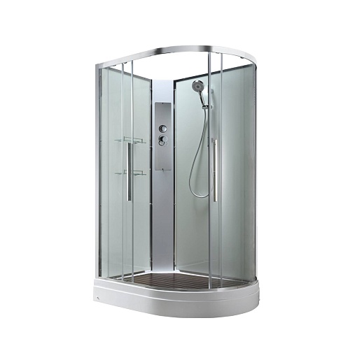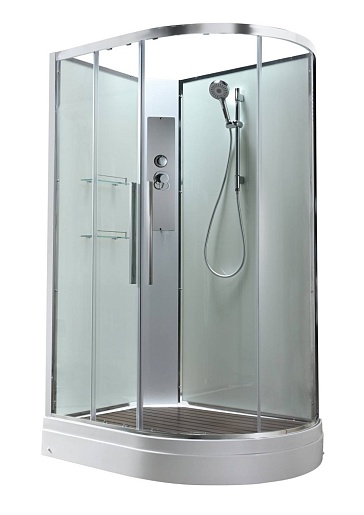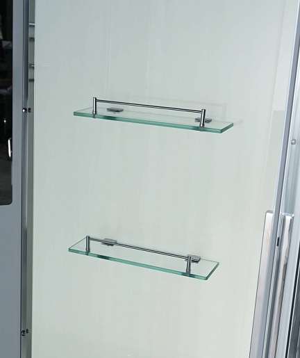 - В комплекте: душевая штанга, две полочки, арома-лейка с витамином С (картридж съемный), полимерная вставка в поддон(имитация дерева), сифон, ручки дверей из нержавейки, двойные ролики.