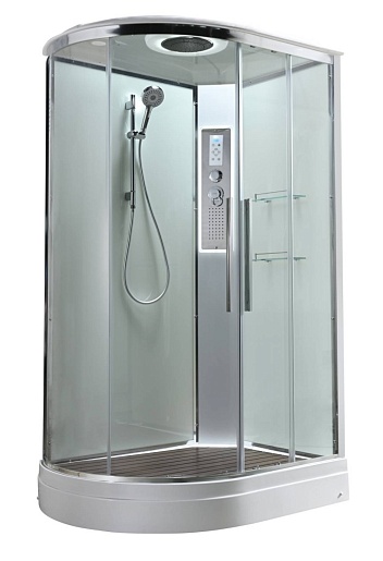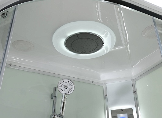 - В комплекте: душевая штанга, две полочки, тропический (верхний) душ, арома-лейка с витамином С (картридж съемный), полимерная вставка в поддон(имитация дерева), сифон, ручки дверей из нержавейки, двойные ролики, пульт сенсорный (Блютуз, LED подсветка, радио, вытяжка), гидромассаж спины.