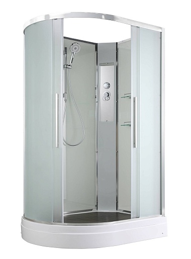 - В комплекте: душевая штанга, две полочки, арома-лейка с витамином С (картридж съемный), полимерная вставка в поддон(имитация дерева), сифон, ручки дверей из нержавейки, двойные ролики.