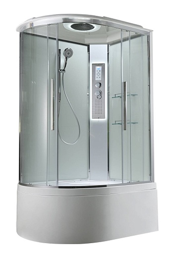 - В комплекте: душевая штанга, две полочки, тропический (верхний) душ, арома-лейка с витамином С (картридж съемный), полимерная вставка в поддон(имитация дерева), сифон, ручки дверей из нержавейки, двойные ролики, пульт сенсорный (Блютуз, LED подсветка, радио, вытяжка), гидромассаж спины.