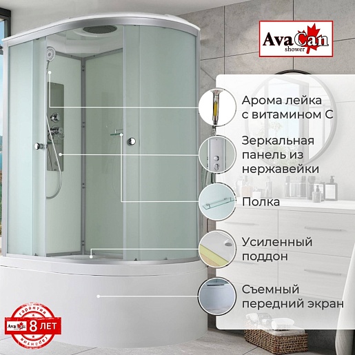 - Сборка без силикона (увеличивает срок службы), внутренняя сборка, смеситель резьбовой (без хомутов), съемный экран поддона, цвет профиля матовый хром.