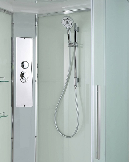 - В комплекте: душевая штанга, две полочки, тропический (верхний) душ, арома-лейка с витамином С (картридж съемный), полимерная вставка в поддон(имитация дерева), сифон, ручки дверей из нержавейки, двойные ролики.