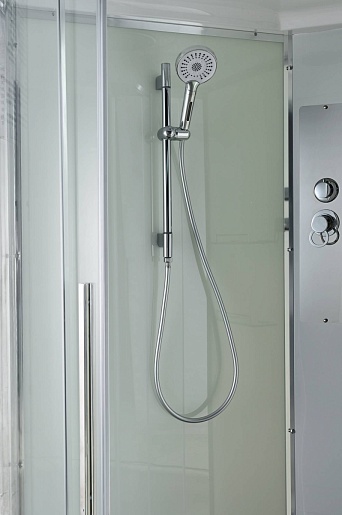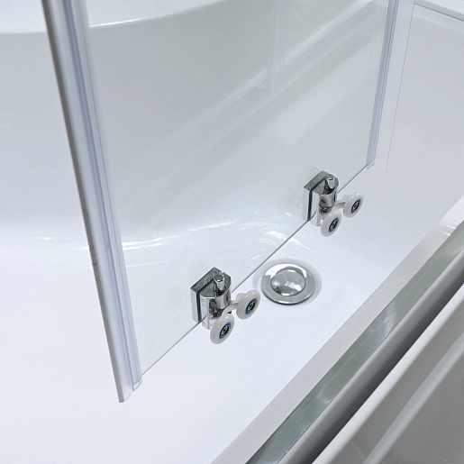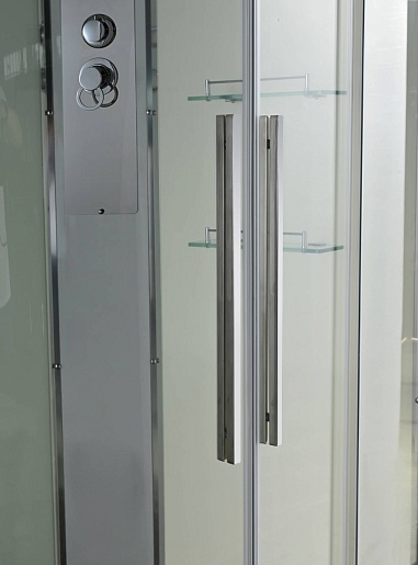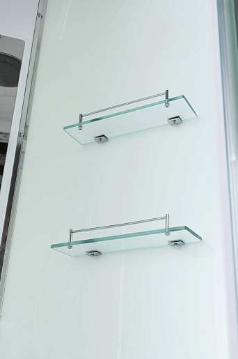 - В комплекте: душевая штанга, две полочки, тропический (верхний) душ, арома-лейка с витамином С (картридж съемный), полимерная вставка в поддон(имитация дерева), сифон, ручки дверей из нержавейки, двойные ролики.