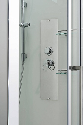 - Душевая штанга(позволяет регулировать по высоте ручную лейку), ручная арома-лейка с витамином С (картридж в комплекте, есть возможность замены или удаления картриджа), полочки(из стекла, с ограничителем), сифон с гидрозатвором.