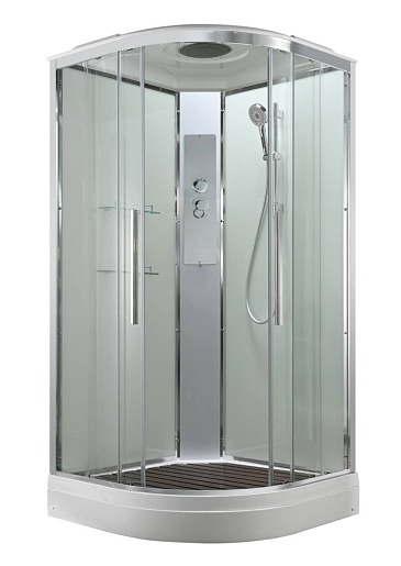 - В комплекте: душевая штанга, две полочки, тропический (верхний) душ, арома-лейка с витамином С (картридж съемный), полимерная вставка в поддон(имитация дерева), сифон, ручки дверей из нержавейки, двойные ролики.