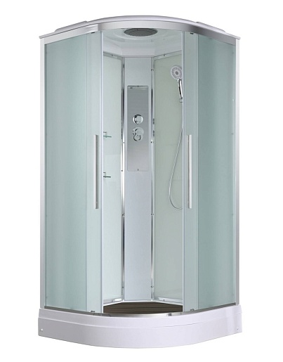 - В комплекте: душевая штанга, две полочки, тропический (верхний) душ, арома-лейка с витамином С (картридж съемный), полимерная вставка в поддон(имитация дерева), сифон, ручки дверей из нержавейки, двойные ролики.