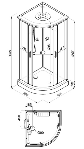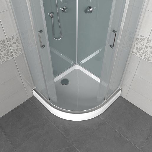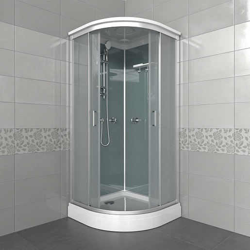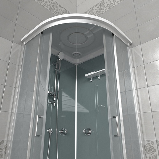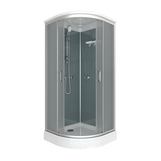 - Оснащение: сифон, душевой набор с лейкой на гибком шланге и верхним душем, полочка с крючками, поддон с бортиком.