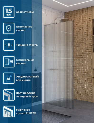 Душевая перегородка Belbagno Uno UNO-L-1-TB-90-FL-Cr 90x200 профиль хром стекло рифленое - арт. UNO-L-1-TB-90-FL-Cr.