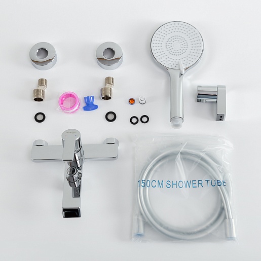 - Оснащение: душевой шланг ПВХ, душевая лейка 3-х режимная из ABS, настенный держатель ручного душа, смеситель.