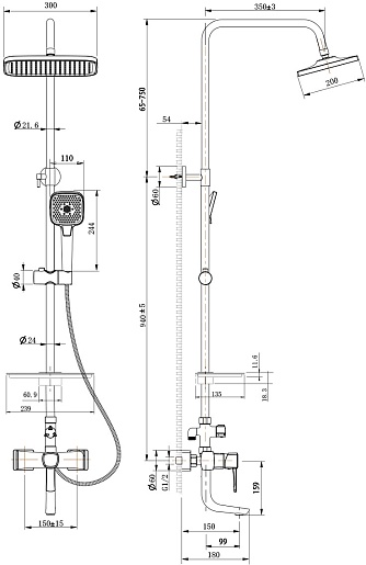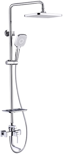 Комплектация: смеситель, шланг, душевая лейка, держатель лейки, верхний душ, штанга, полочка.