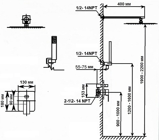 - Верхний душ: нержавеющая сталь, 25х25 см.