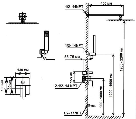 - Вынос верхнего душа: 40 см.