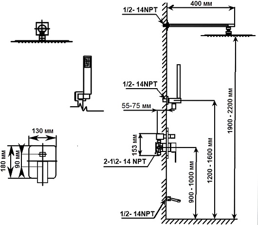 - Верхний душ: нержавеющая сталь, 25х25 см.