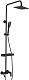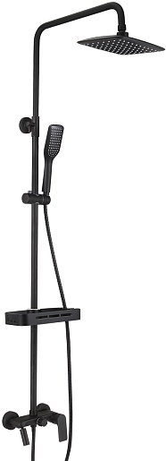 Комплектация: смеситель, шланг, душевая лейка, держатель лейки, верхний душ, штанга, полочка.