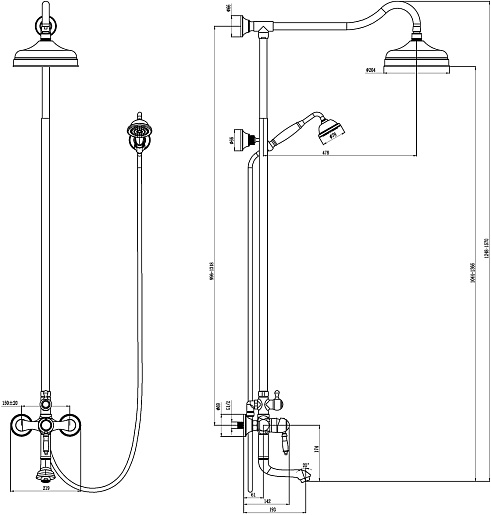 Комплектация: смеситель, шланг, душевая лейка, держатель лейки, верхний душ, штанга.