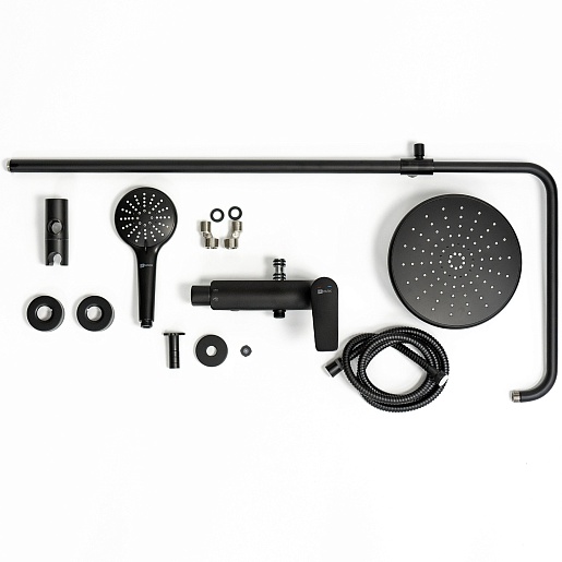 Комплектация: смеситель, шланг, душевая лейка, держатель лейки, верхний душ, штанга.