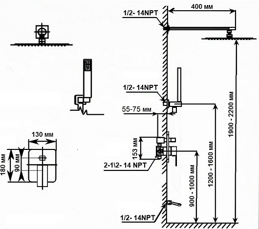 - Верхний душ: нержавеющая сталь, 25х25 см.