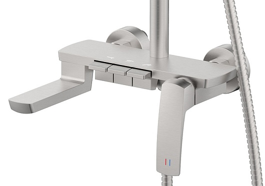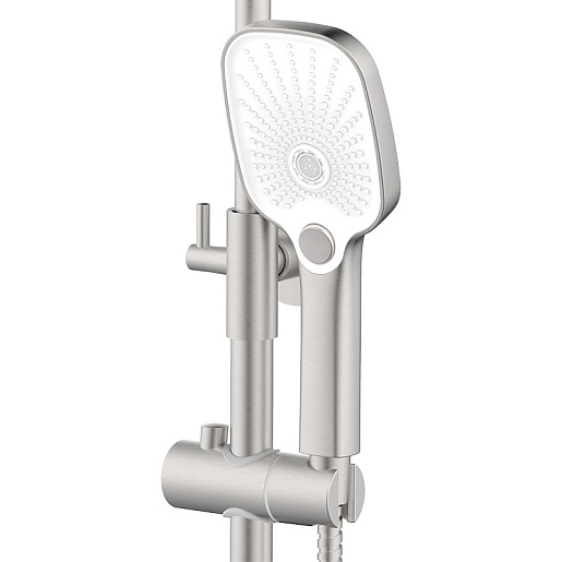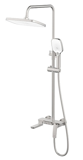 - Система включает всё необходимое для полноценных водных процедур: верхний душ «тропический ливень» с квадратной панелью, создающий равномерную и нежную струю, и удобную ручную лейку на металлическом шланге длиной 150 см. - Переключайтесь между двумя режимами подачи воды одним движением.