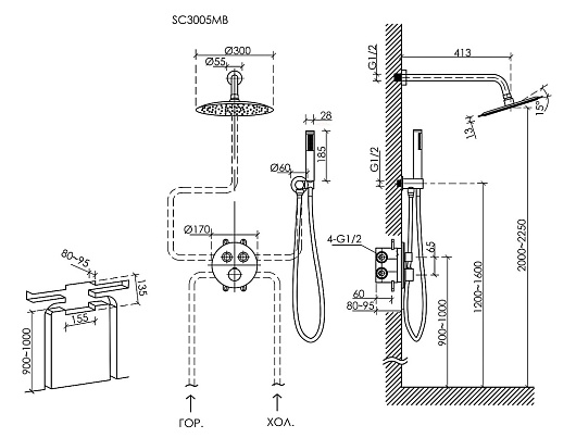 - Размер верхнего душа: 30 см.- Вылет верхнего душа: 41.3 см.