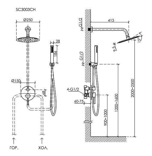 - Размер верхнего душа: 25 см.- Вылет верхнего душа: 41.3 см.