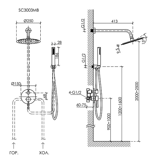 - Размер верхнего душа: 25 см.- Вылет верхнего душа: 41.3 см.