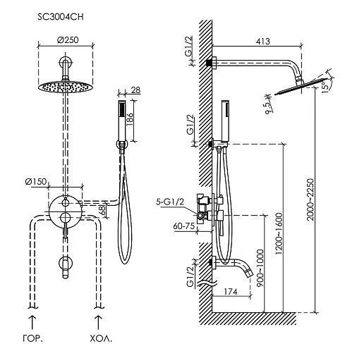 - Размер верхнего душа: 25 см.- Вылет верхнего душа: 41.3 см.