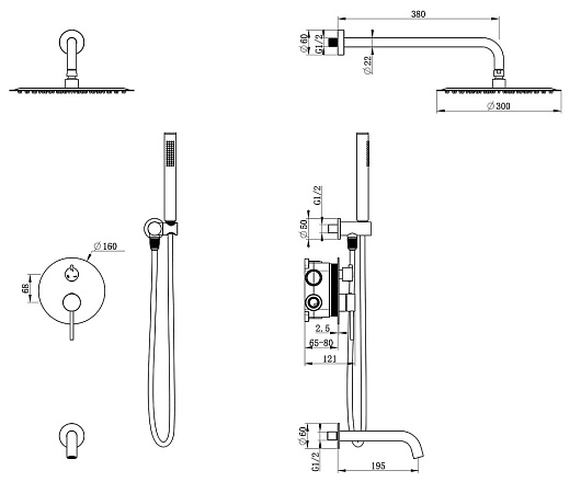 - Состав комплекта: верхний душ, душевой гарнитур, излив, смеситель для ванны с душем, настенный держатель.
